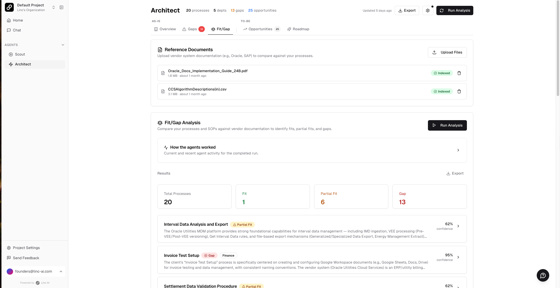 If your project involves implementing a new system (ERP, CRM, EMR, etc.), the Fit/Gap tab compares your documented processes against vendor documentation to identify where the system fits, partially fits, or has gaps. This is primarily used by implementation consultants and system integrators.