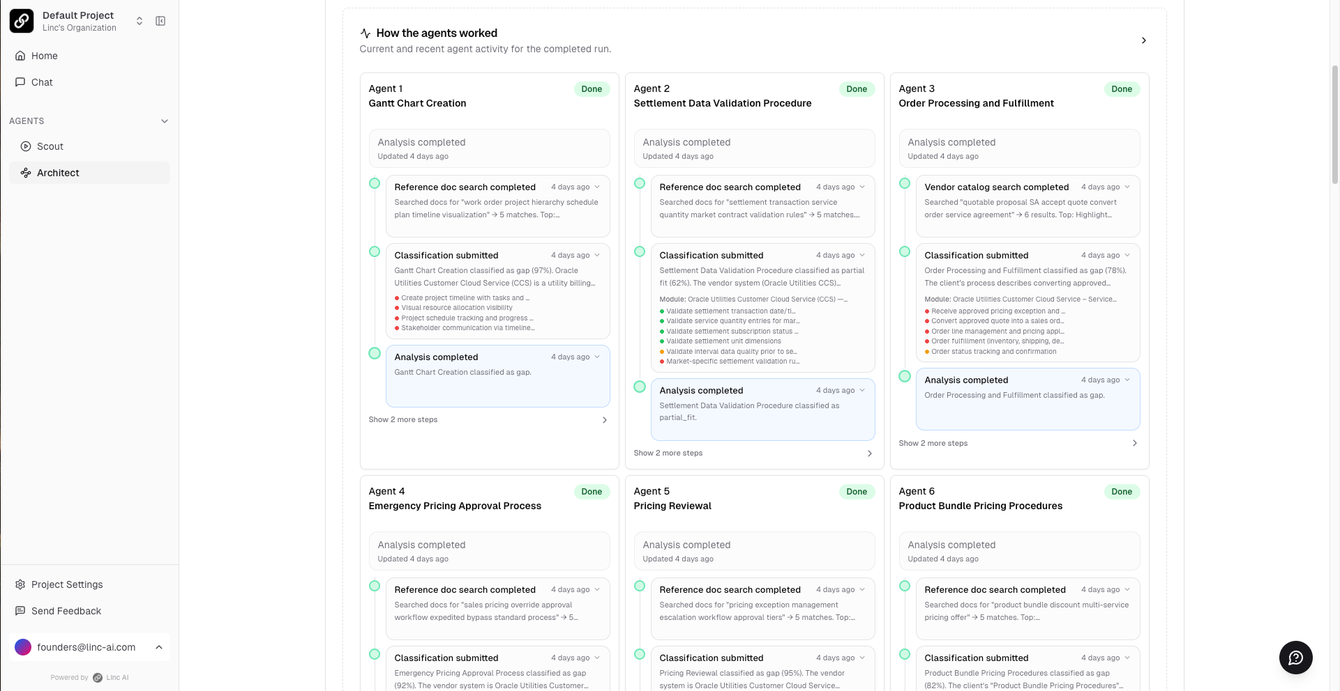 Click Run Analysis. The platform deploys a swarm of agents — one per documented process — to search through all vendor documentation.