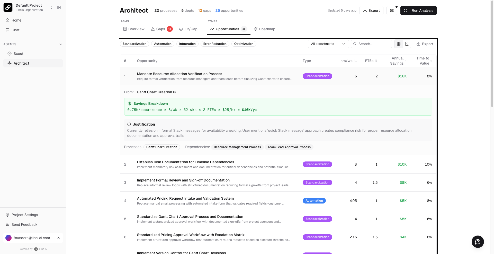 The Opportunities tab delivers a ranked list of improvement opportunities derived from all documented processes. Each opportunity includes:
