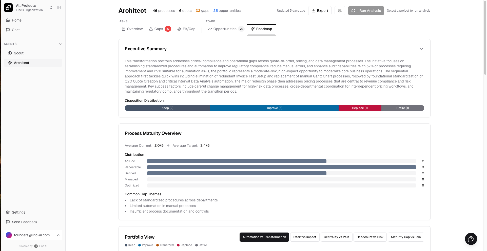 The Roadmap tab builds a phased implementation plan based on the gap analysis and opportunities. It includes:
