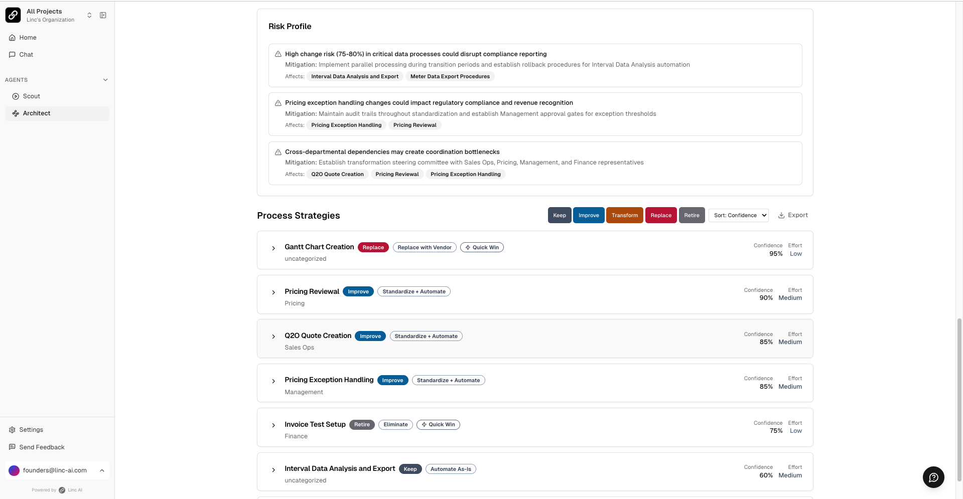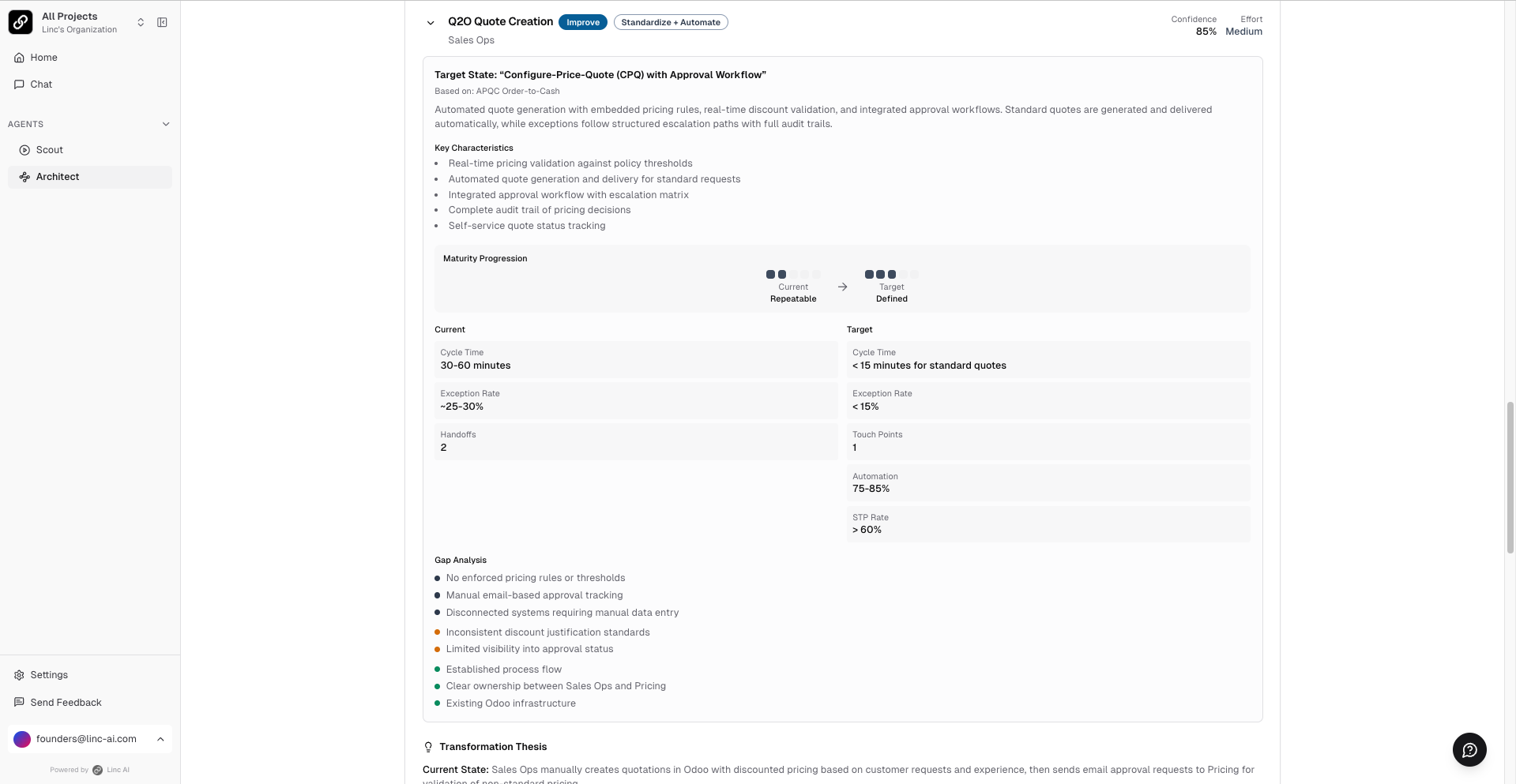 - Process strategies — For each workflow, a detailed transformation thesis with gap analysis, key pain points, justification, strategic scores, and confidence levels with citations.