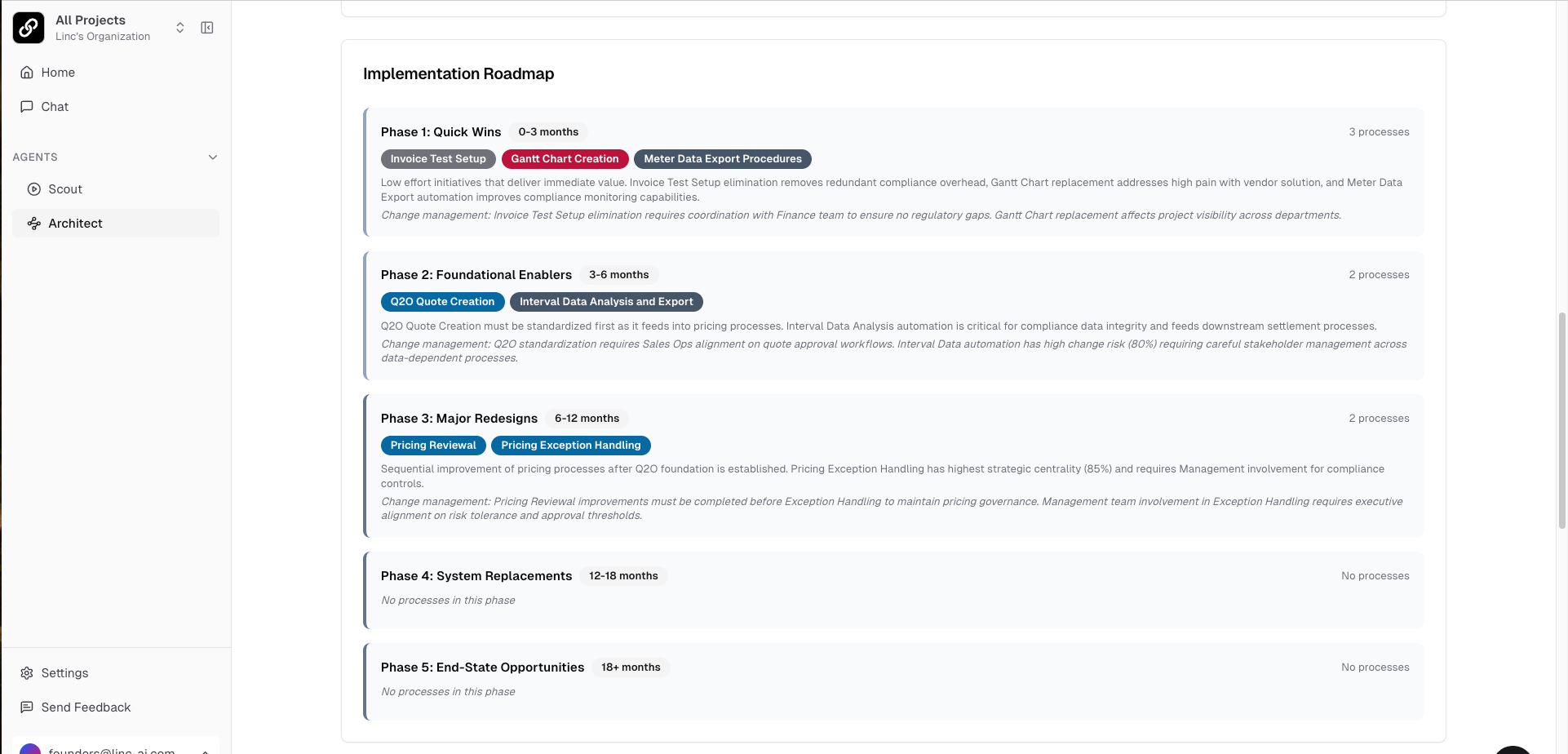 - Implementation phases — Quick wins, foundational enablers, major redesigns, system replacements, and end-state opportunities.