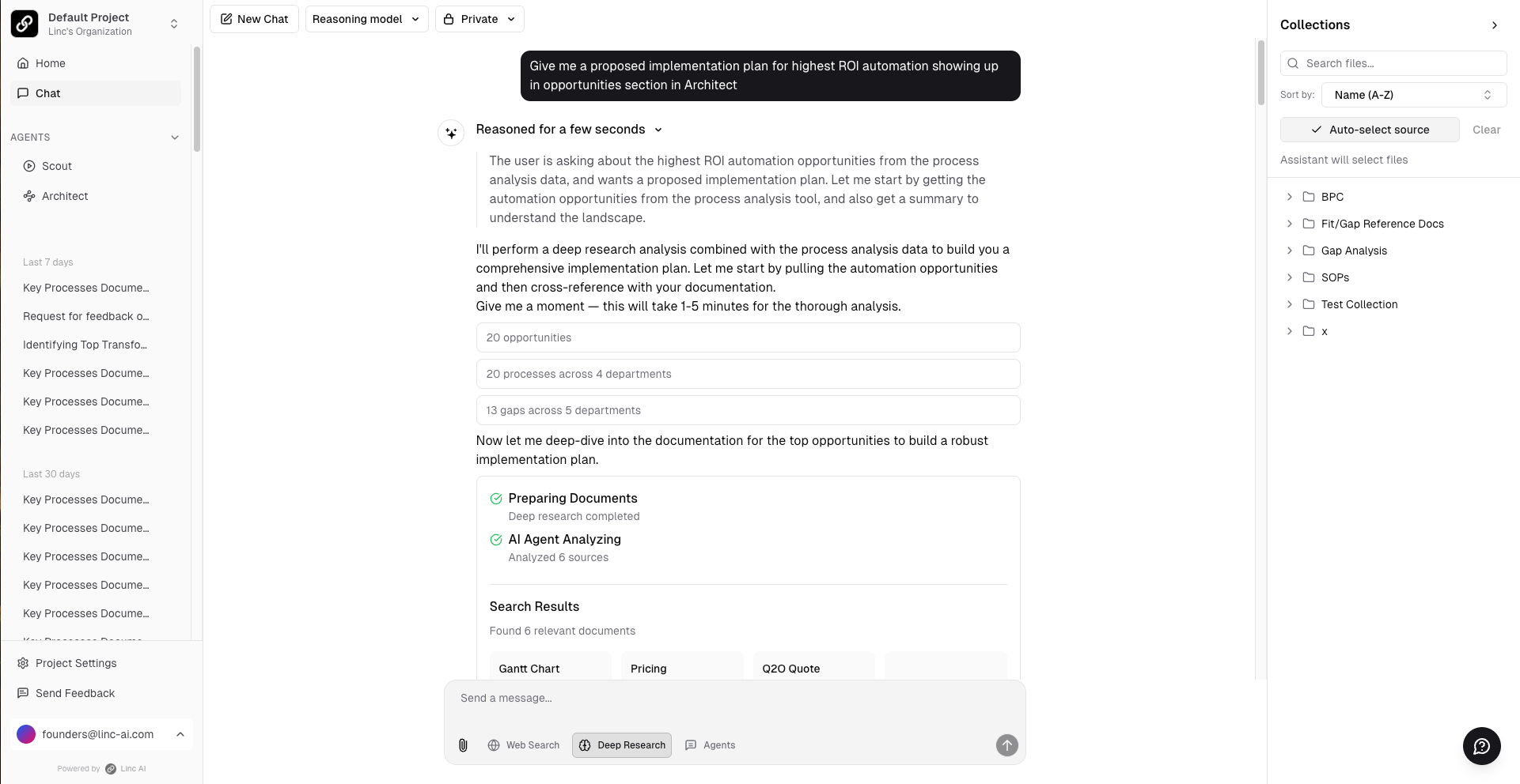 The Chat interface provides a natural language layer over all your documented processes, generated SOPs, gap analyses, and uploaded business documents. Think of it as a knowledgeable assistant that has read every document in your project and can answer questions with citations to the source material.