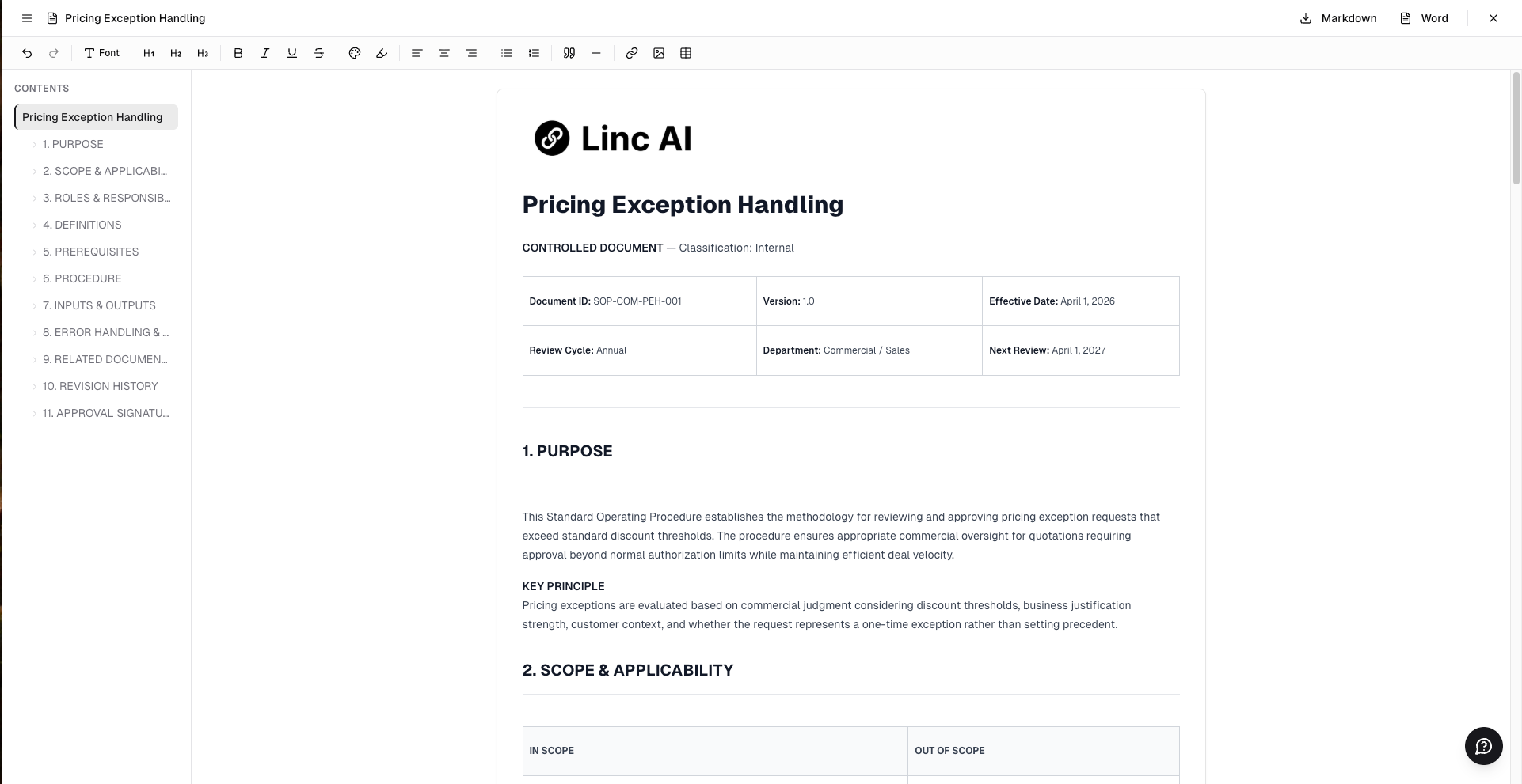 A structured document including purpose, scope, roles and responsibilities, step-by-step procedure with decision points, inputs and outputs, error handling, and revision history. SOPs follow your organization's template if one has been configured by an admin.