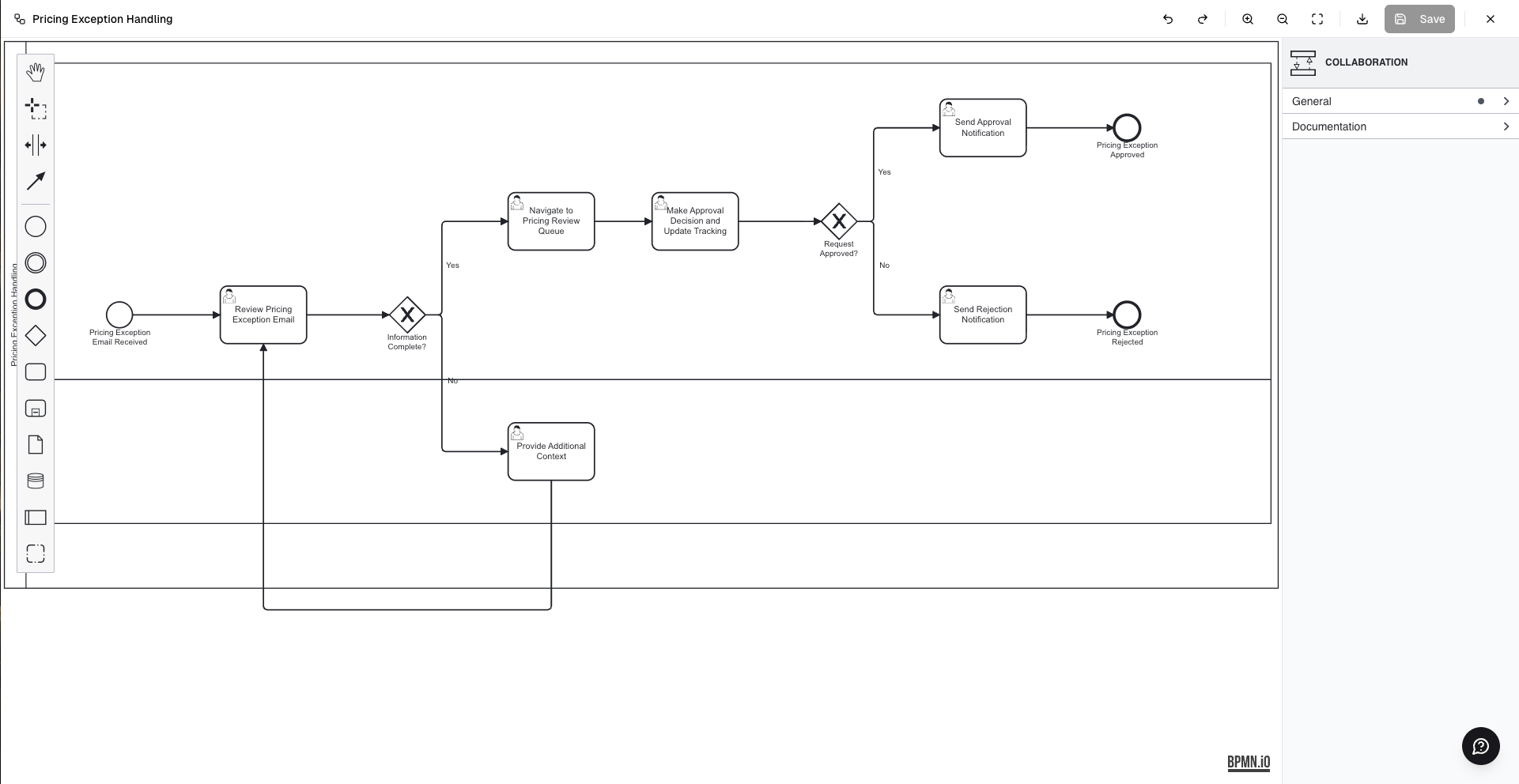 A Business Process Model and Notation diagram showing the complete workflow with swim lanes for different roles, decision gates, and task categorization. This can be exported as a BPMN file for use in downstream tools like UiPath or Camunda.