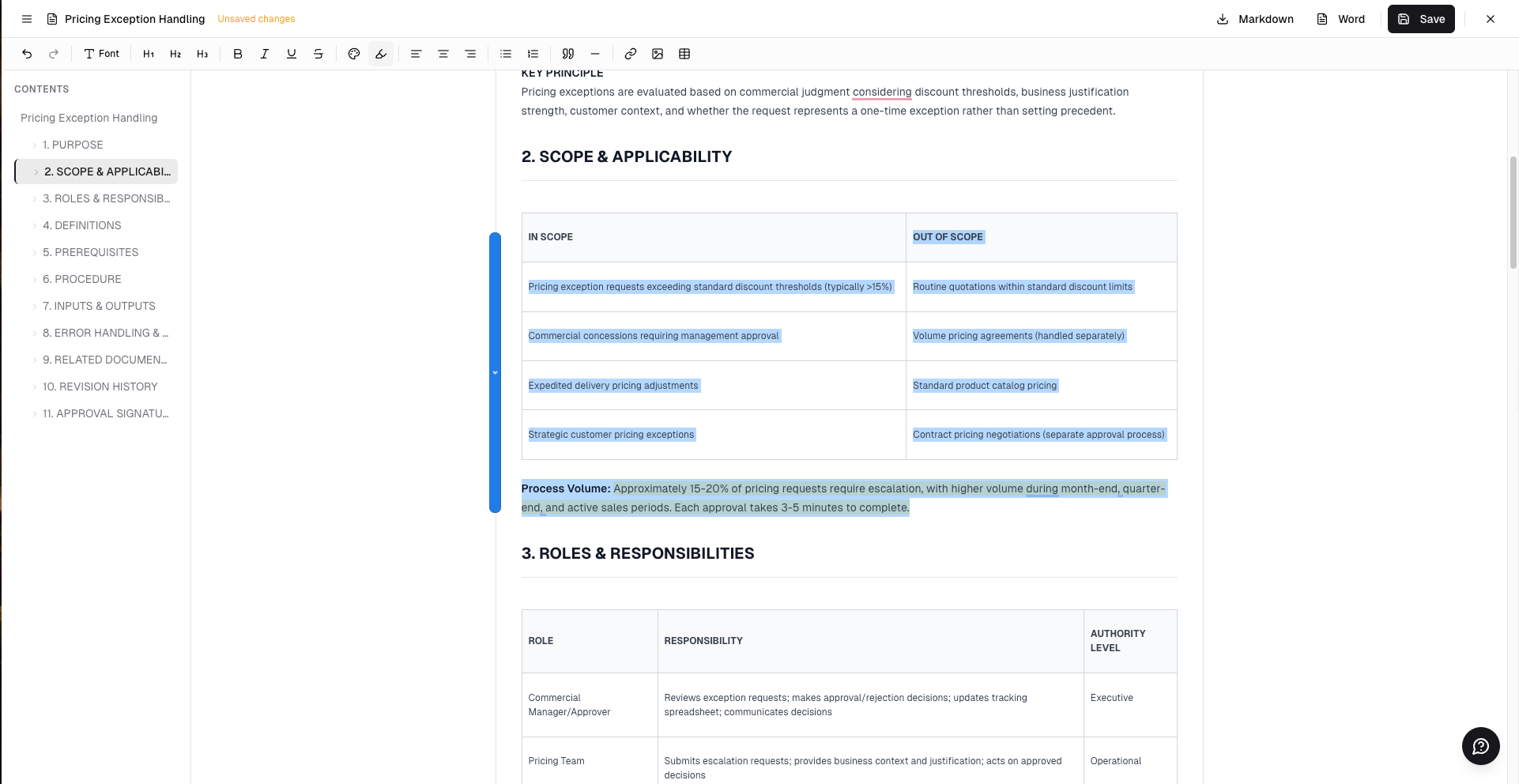 | SOP | Edit directly in the built-in document editor. Add links, update language, restructure sections. | Markdown, Word (.docx) |